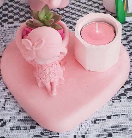 En color rosado, hecho de yeso, con planta natural, tierra, piedras de colores.