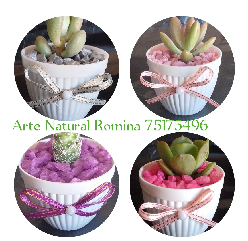 Una plantita natural, tierra, piedras de colores y moñito de cinta.