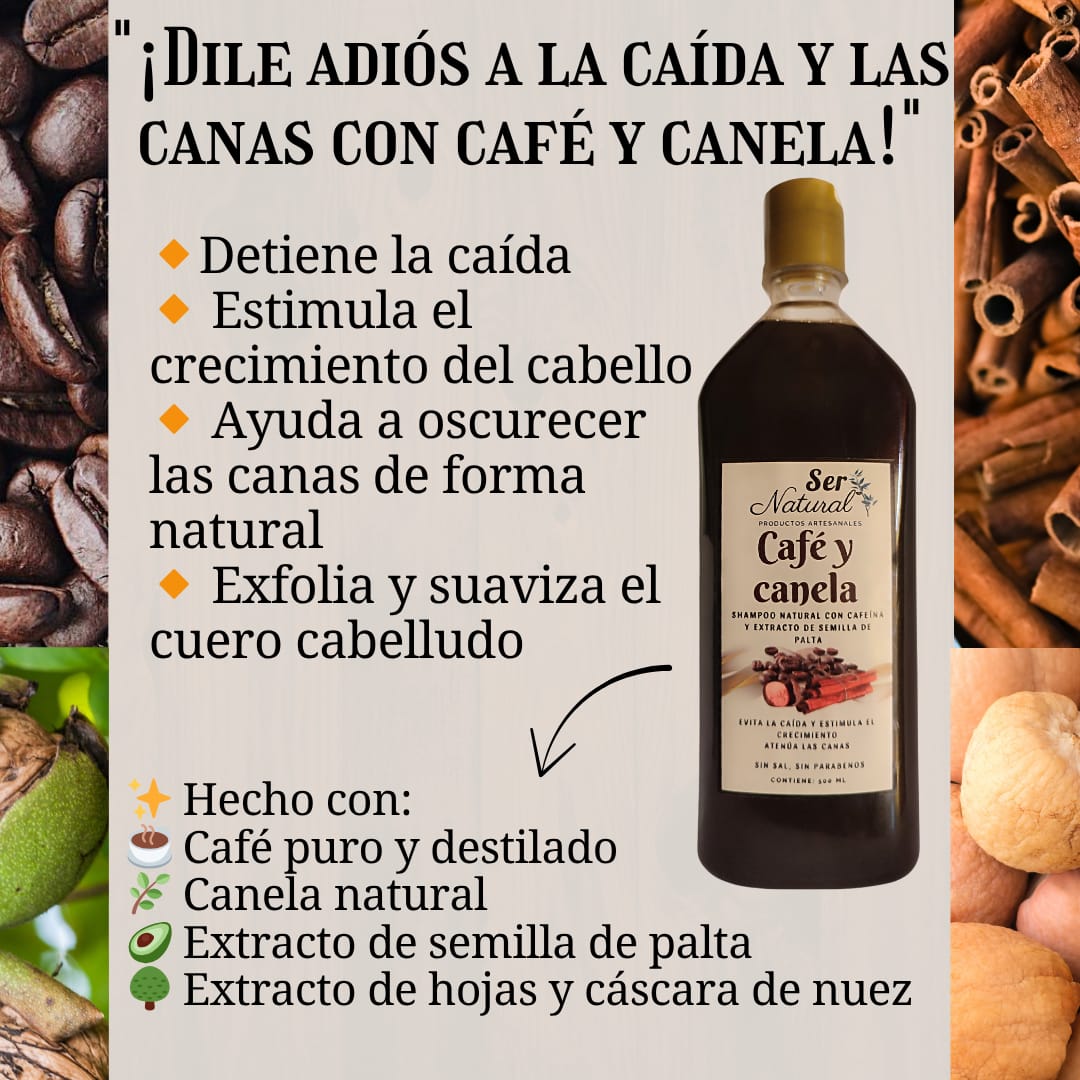 Shampoo de café y canela con extracto de semilla de palta, presentación de 500ml SIN SAL ni parabenos, trata la caída del cabello, las canas, cabello mas fuerte y saludable.
